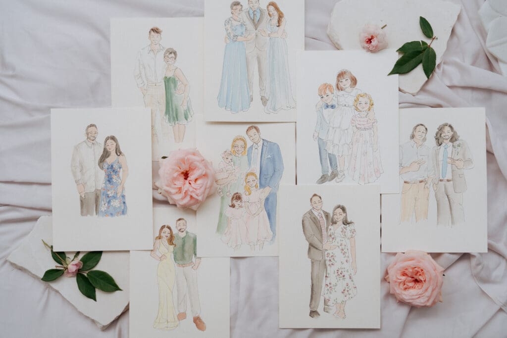 Instead of snapping a photo, I sketch your guests by hand, capturing their outfits, energy, and those tiny moments that make your day feel like yours. Each portrait takes only a few minutes, and guests love watching their sketch appear line by line.
